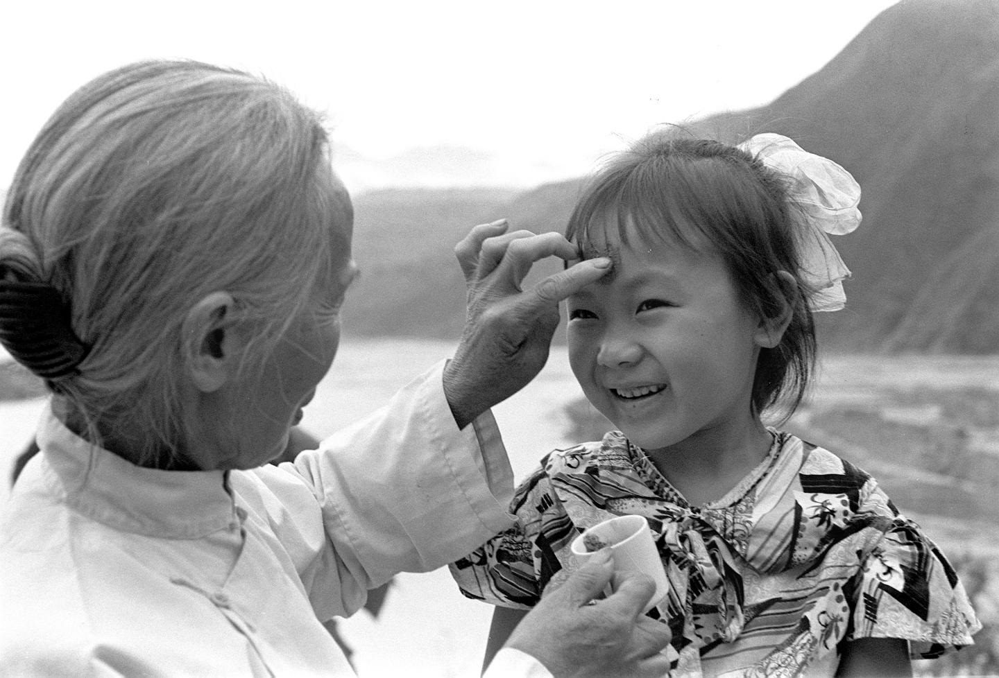 1982年,湖北秭歸的一位老人給小孫女點(diǎn)雄黃。每逢端午節(jié),給小孩額頭點(diǎn)上用酒浸過(guò)的雄黃,表示可以驅(qū)毒避邪、平安幸福。