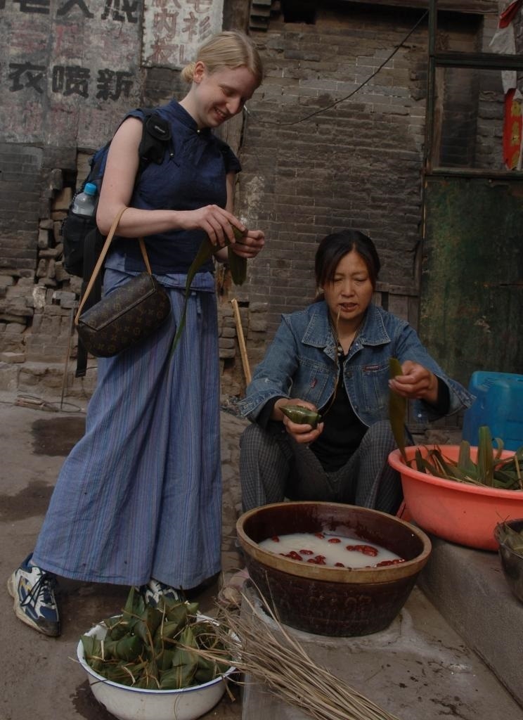 2006年5月31日,在山西省平遙縣街頭,一名外國(guó)游客在學(xué)習(xí)包粽子。