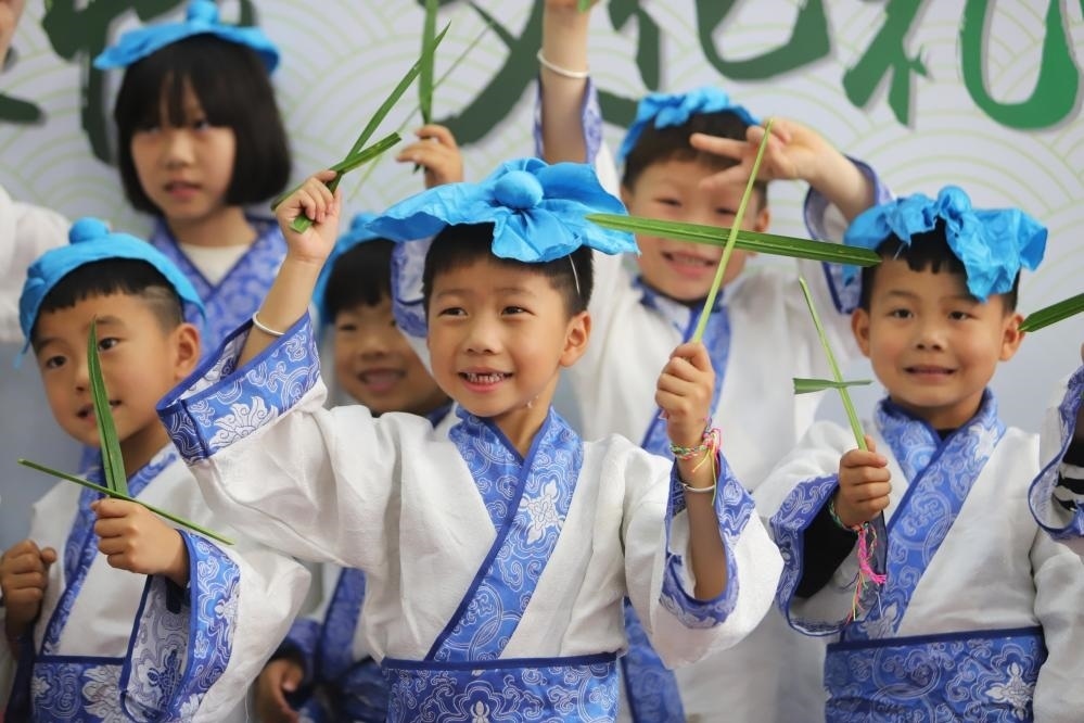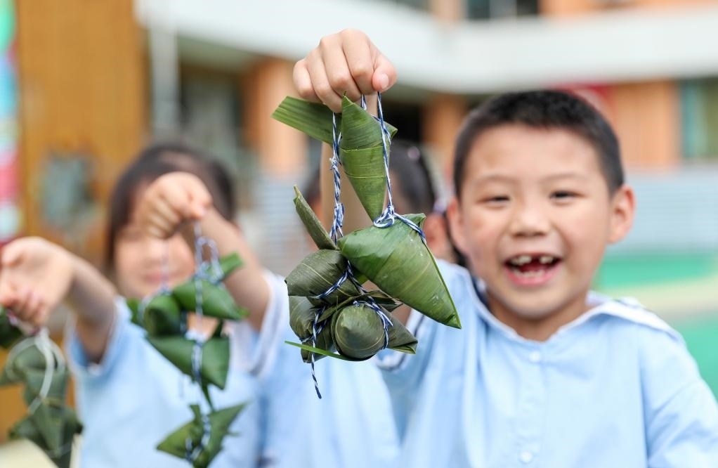 2024年6月5日,四川省華鎣市杜家坪幼兒園的小朋友展示自己包的粽子。