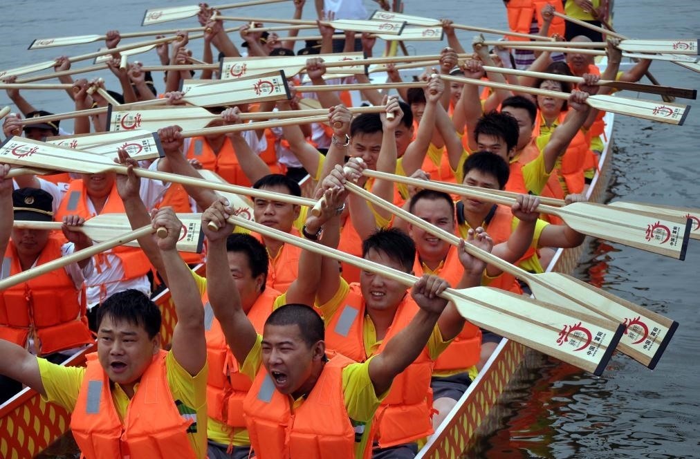 2011年6月6日,在河南省鄭州東區(qū)的如意湖上,舉行了一場(chǎng)龍舟挑戰(zhàn)賽,兩支龍舟隊(duì)的選手們?cè)诒荣愰_始前舉槳大吼以壯氣勢(shì)。