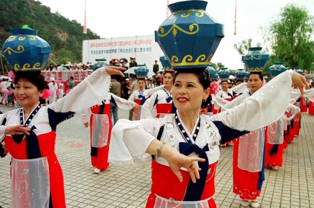 2002年6月15日,人們?cè)诩质〖质信e行第二屆朝鮮族端午民俗藝術(shù)節(jié)上表演“頂水舞”。