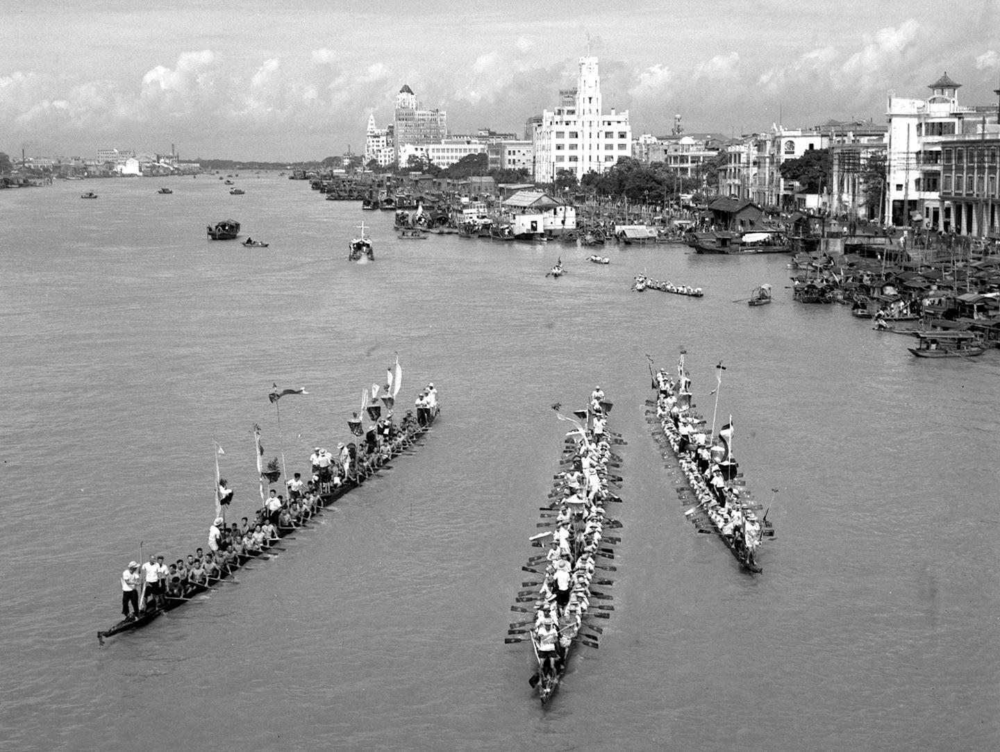 1955年,參加表演的龍舟經(jīng)過(guò)廣州市區(qū)的珠江水面。
