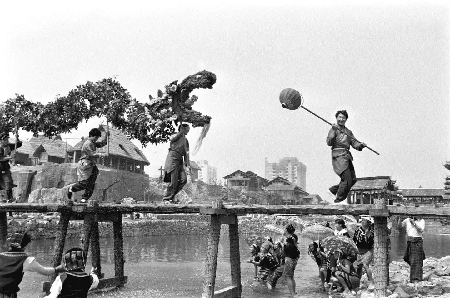 1995年6月2日,羌族青年在北京的中華民族園表演“飛龍過(guò)江”。
