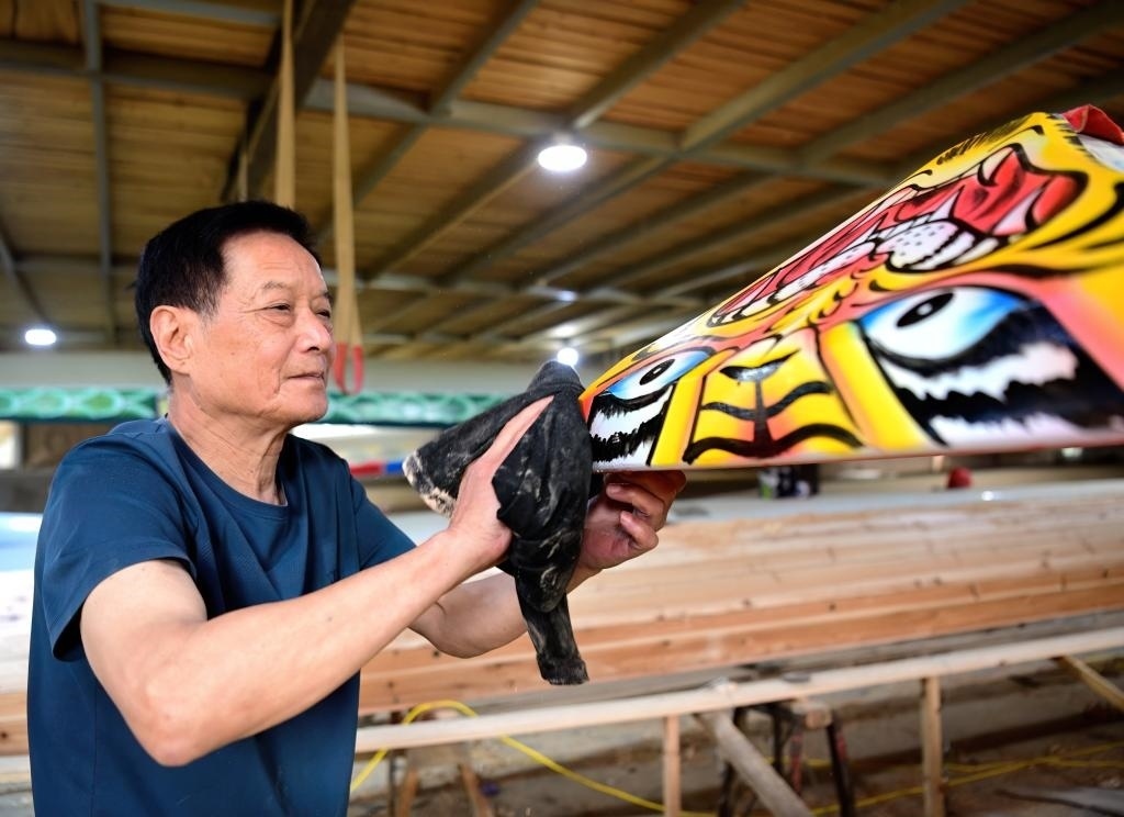 2024年6月3日,福州市非物質(zhì)文化遺產(chǎn)“方莊龍舟制造技藝(閩侯縣)”的傳承人方紹晃在擦拭準(zhǔn)備交付的龍舟船頭。方莊村是福建遠(yuǎn)近聞名的“龍舟村”,制造龍舟的技藝已傳承了700多年,每年有200余艘傳統(tǒng)龍舟銷往全國(guó)及海外。方紹晃介紹說(shuō),制作一艘福州傳統(tǒng)龍舟從原料選擇到制作都非常講究,主要選取閩北山區(qū)樹齡40年以上的杉木和樟木為原材料,歷經(jīng)做龍骨、釘?shù)装?、裝魚梁、拋光、畫花、上油漆等多道工序,最后裝上精心雕刻的龍頭才算大功告成。