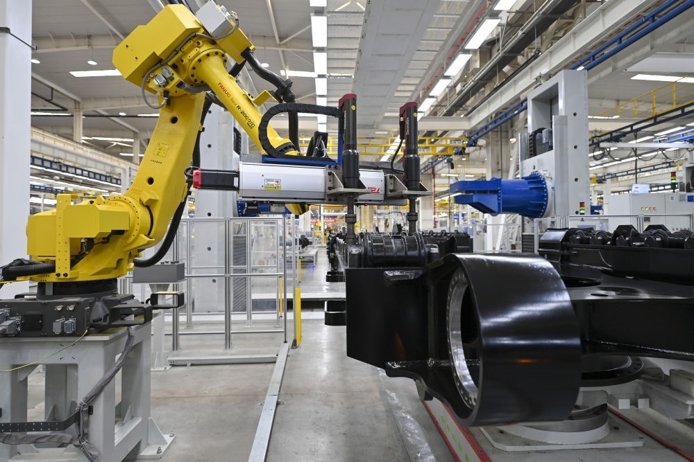 2024年4月9日,在山西太原太重集團智能高端液壓挖掘機產業(yè)園區(qū),智能裝配機器人在智能生產線上作業(yè)。