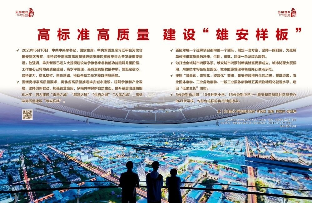 設(shè)立河北雄安新區(qū),是以習(xí)近平同志為核心的黨中央為疏解北京非首都功能、深入推進(jìn)京津冀協(xié)同發(fā)展作出的一項(xiàng)重大決策部署,是千年大計(jì)、國家大事。習(xí)近平總書記強(qiáng)調(diào),要貫徹高質(zhì)量發(fā)展要求,創(chuàng)造“雄安質(zhì)量”,在推動(dòng)高質(zhì)量發(fā)展方面成為全國的一個(gè)樣板。