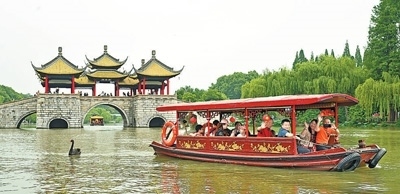 文旅融合市民和游客乘坐游船游覽揚(yáng)州瘦西湖。本報(bào)記者 雷 聲攝