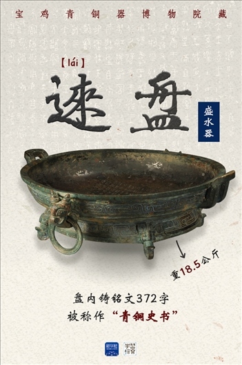 這件青銅器是被稱作“青銅史書”的逨盤。盤內(nèi)鑄銘文372字,完整記錄了單氏家族八代人輔佐西周12位周王征戰(zhàn)、理政、管治林澤的重要史事。從銘文中可看出,周人將家族命運(yùn)和國家命運(yùn)緊密結(jié)合,也是后來儒家“修身、齊家、治國、平天下”的思想基礎(chǔ)。