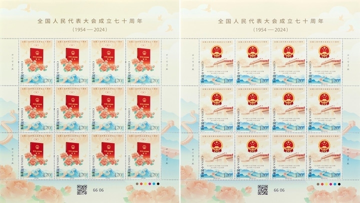 中國(guó)郵政發(fā)行《全國(guó)人民代表大會(huì)成立七十周年》紀(jì)念郵票1套2枚,郵票圖案名稱為弘揚(yáng)憲法精神、發(fā)展全過(guò)程人民民主。
