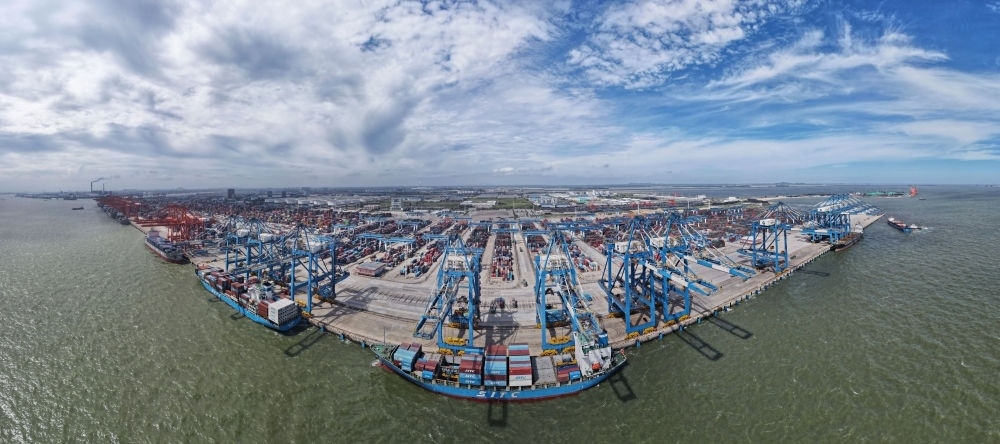 2024年6月13日,途經(jīng)馬來西亞關(guān)丹港的“海豐博多”輪在廣西欽州港集裝箱裝卸自動化碼頭進行裝卸作業(yè)(無人機全景照片)。