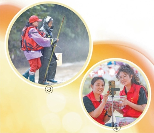 圖③:安徽省歙縣山越救援隊黨員(左)在轉(zhuǎn)移受災群眾。樊成柱攝(影像中國) 圖④:新疆維吾爾自治區(qū)烏蘇市黨員志愿者到田間地頭直播銷售草莓。李仁錫攝(影像中國)
