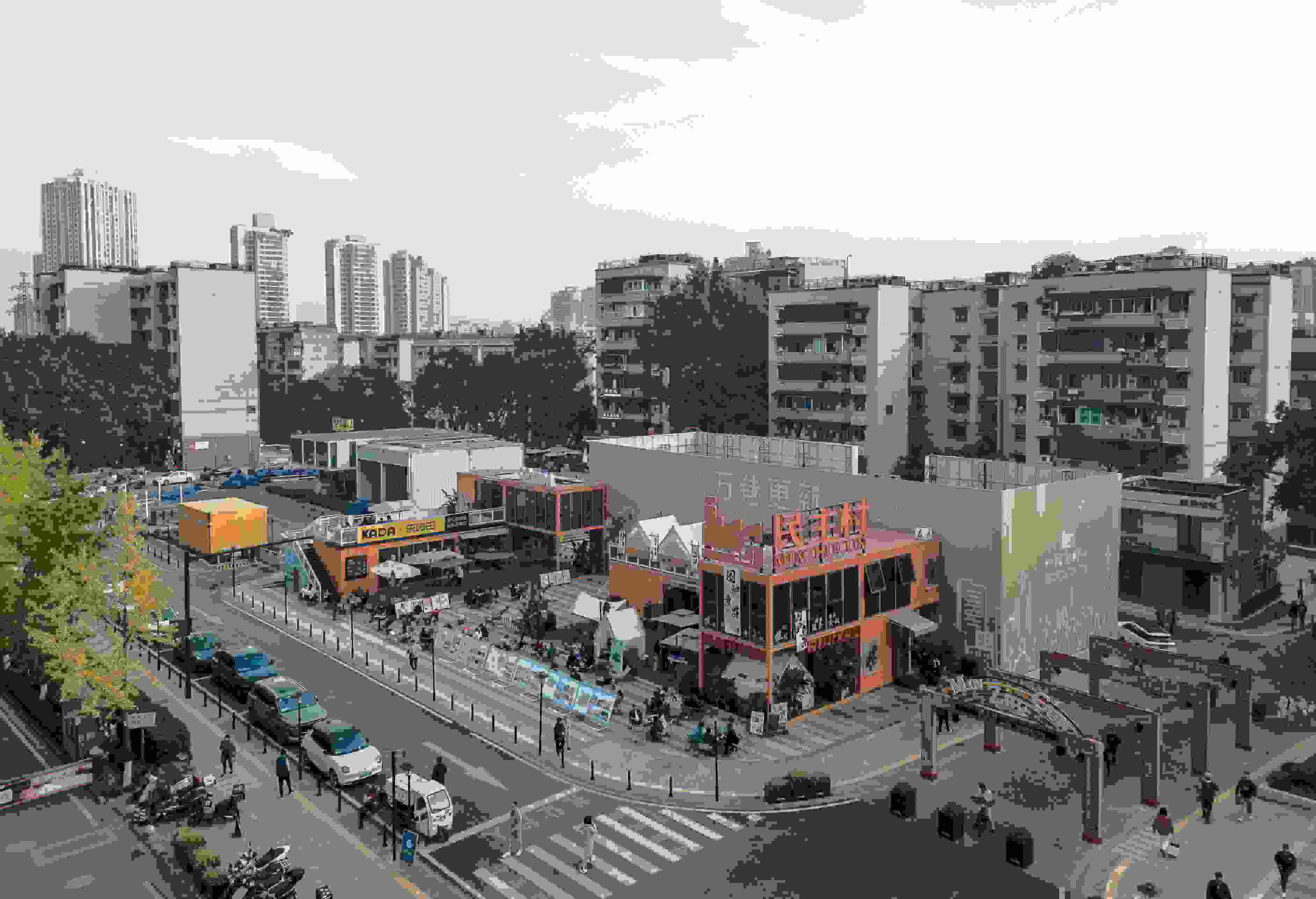 △民主村社區(qū)入口處,以集裝箱為載體打造的餐飲集聚區(qū)。