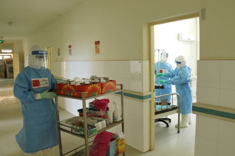2020年5月26日,在剛果(布)首都布拉柴維爾,中國抗疫醫(yī)療專家組與當?shù)匾痪€醫(yī)務人員交流,指導新冠肺炎病房建設。