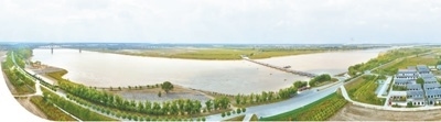 秋日的山東東營黃河畔,林帶染金,游人如織。
