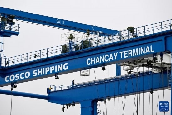 這是6月21日在秘魯錢凱港拍攝的印有“中遠海運,錢凱碼頭”字樣的軌道吊。 新華社記者 李木子 攝