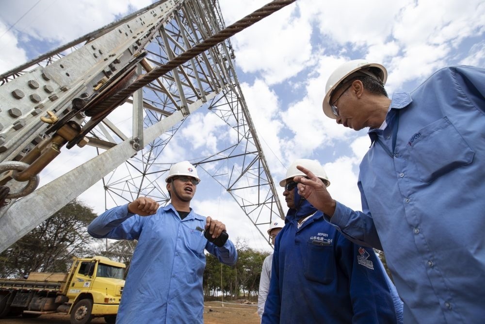 2018年8月7日,在巴西東南部米納斯吉拉斯州阿科斯市附近,巴西美麗山特高壓輸電工程二期第九標段項目中方現場施工管理負責人(左)在施工現場指導巴方員工。美麗山水電站二期項目是中國國家電網公司首個在海外獨立投資、建設和運營的特高壓直流輸電工程,也是“特高壓+清潔能源”在拉美的示范工程。