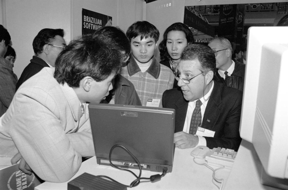 1995年12月14日,巴西外貿及合資項目洽談會在上海舉行。這是一位參展商向參觀者介紹巴西電腦網絡系統(tǒng)軟件設備。