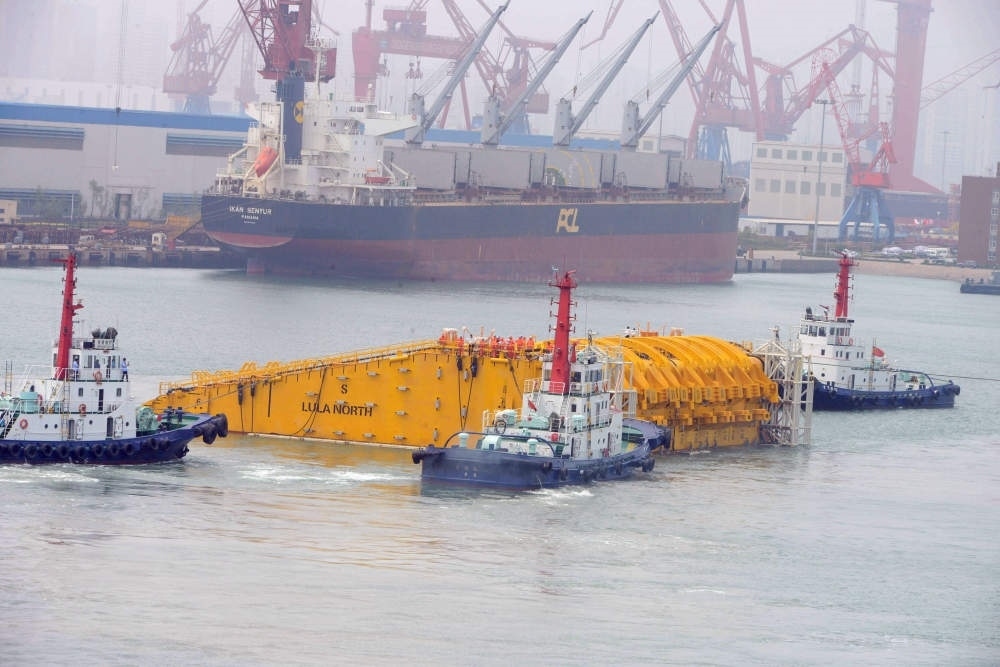 2013年7月15日,出口巴西的深海石油開采浮體在拖船牽引下離開山東青島港碼頭。這套浮體服務于巴西近海300公里桑托斯盆地的深海油田。