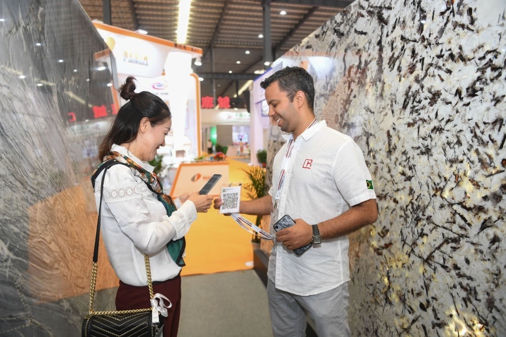 2019年11月8日,巴西商人馬庫斯在福建省南安市水頭鎮(zhèn)舉辦的國際石材博覽會上向國內客商出示自己的微信二維碼。