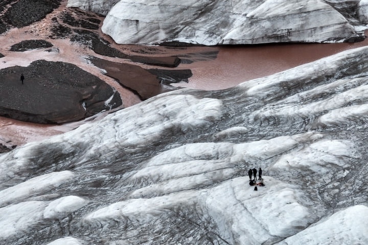 2024年7月25日,在青海省三江源區(qū)冬克瑪?shù)妆?,江源綜合科學(xué)考察隊員在探測冰川。新華社記者 伍志尊 攝