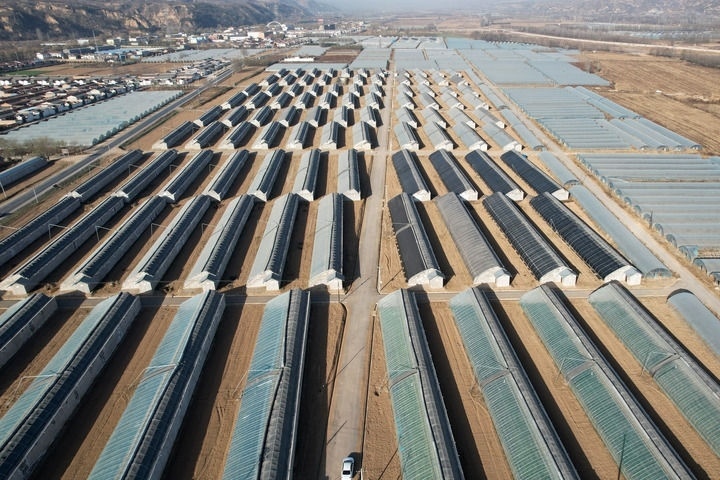 2023年11月26日,甘肅省平?jīng)鍪袥艽h涇汭河川區(qū)萬畝設(shè)施蔬菜產(chǎn)業(yè)園王村核心區(qū)(無人機照片)。這是當?shù)匾劳刑旖蚴袞|西部協(xié)作幫扶資金實施的聯(lián)建項目。新華社記者 范培珅 攝