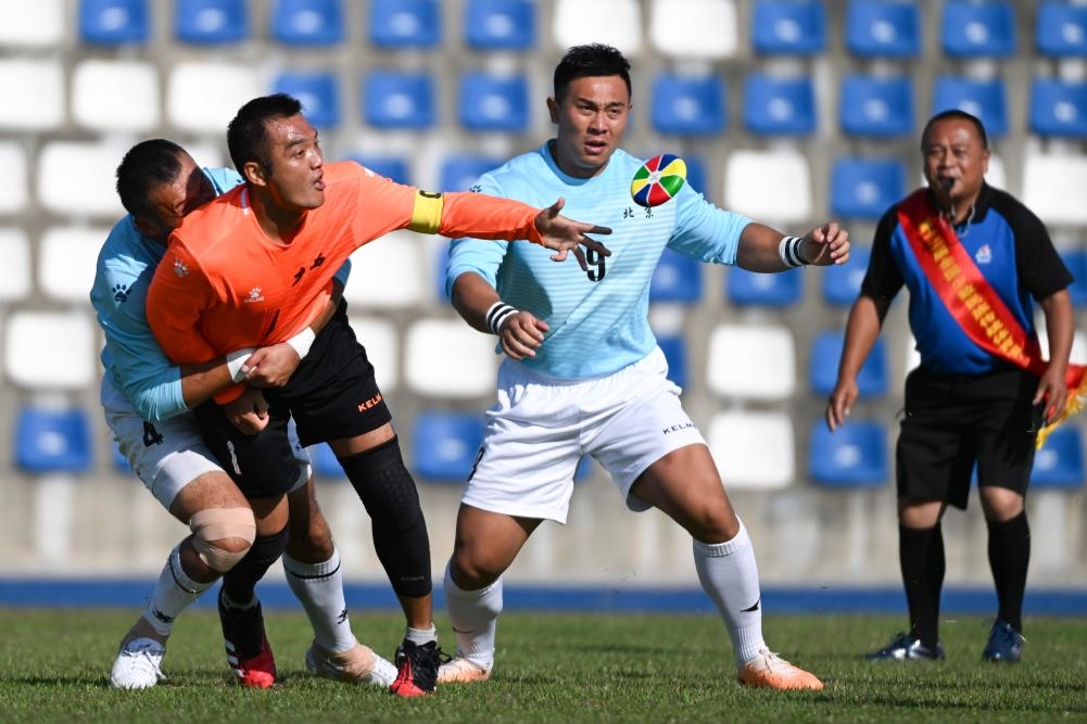 ??11月24日,在三亞市體育中心舉行的第十二屆全國少數(shù)民族傳統(tǒng)體育運動會室外表演項目中,新疆隊球員阿卜杜拉艾孜則·阿卜杜海娃爾(前右)在麥熱球表演中。新華社記者 陳朔 攝