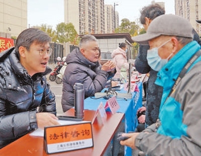 寶山區(qū)新顧城大居拓展區(qū)聯(lián)合黨支部開展便民服務(wù)活動。圖為工作人員為居民提供法律咨詢。