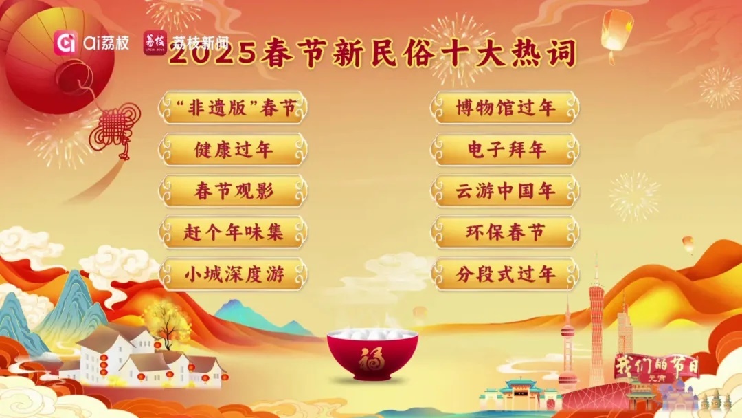 活動接近尾聲之際,2025年“春節(jié)新民俗十大熱詞”評選環(huán)節(jié)正式開啟。通過深入分析微博、微信、抖音及人民網(wǎng)、中國精神文明網(wǎng)、學(xué)習(xí)強(qiáng)國、ai荔枝、荔枝新聞等網(wǎng)絡(luò)平臺上的互動留言及熱度指數(shù),與新民俗相關(guān)的20個高頻熱詞脫穎而出。在短短四天內(nèi),數(shù)十萬網(wǎng)友踴躍參與了網(wǎng)絡(luò)投票。截至2月12日15時(shí),投票總數(shù)已飆升至764832票,當(dāng)晚“我們的節(jié)日 歡樂中國年”乙巳蛇年元宵特別節(jié)目中,春節(jié)新民俗十大熱詞火熱揭曉。“‘非遺版’春節(jié)”、“健康過年”、“春節(jié)觀影”等熱詞以高票數(shù)位居前列。