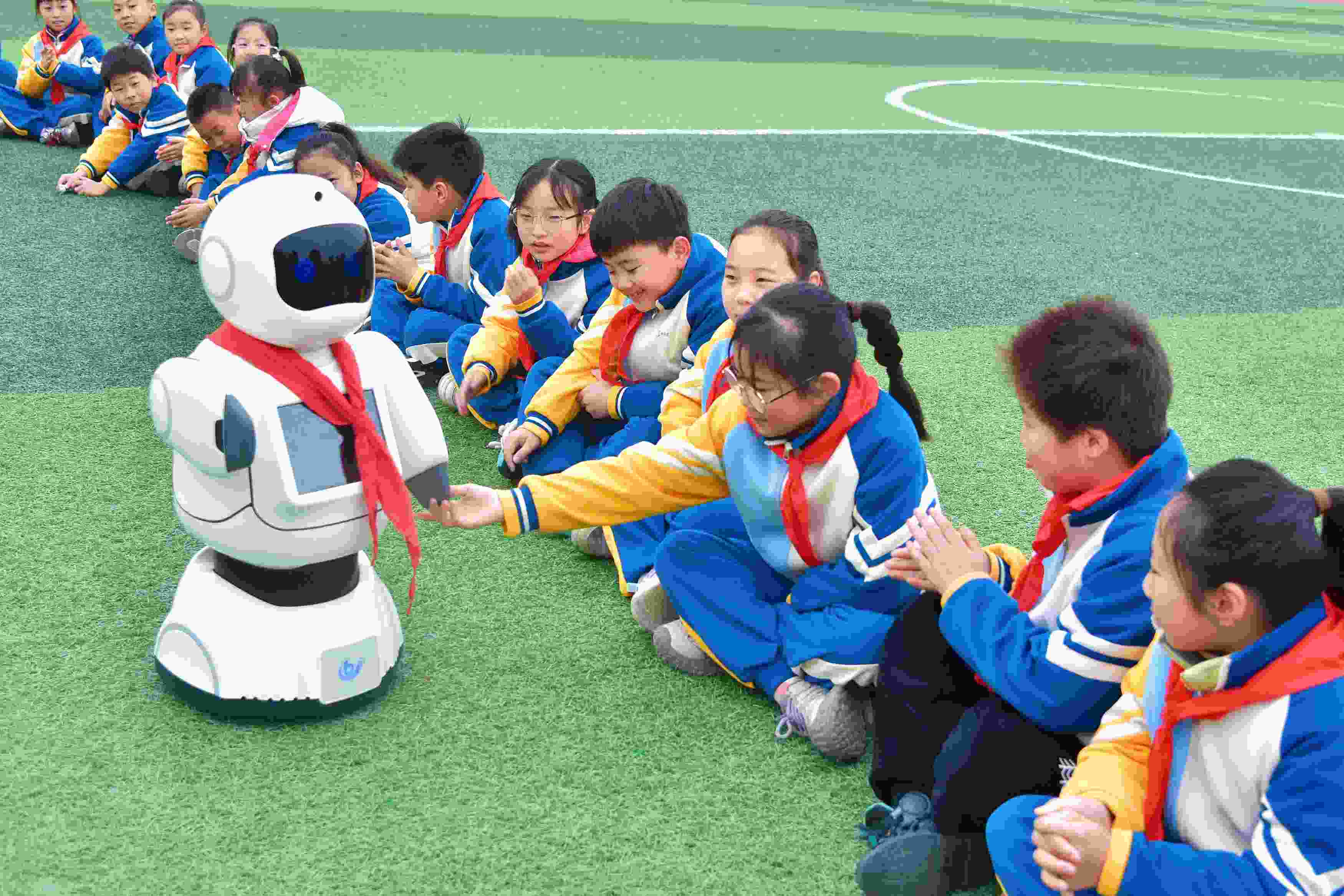 △2025年3月10日,江蘇南通,如皋經(jīng)濟(jì)技術(shù)開發(fā)區(qū)實(shí)驗(yàn)小學(xué)課間,學(xué)生與智能機(jī)器人“賓果”互動(dòng)。
