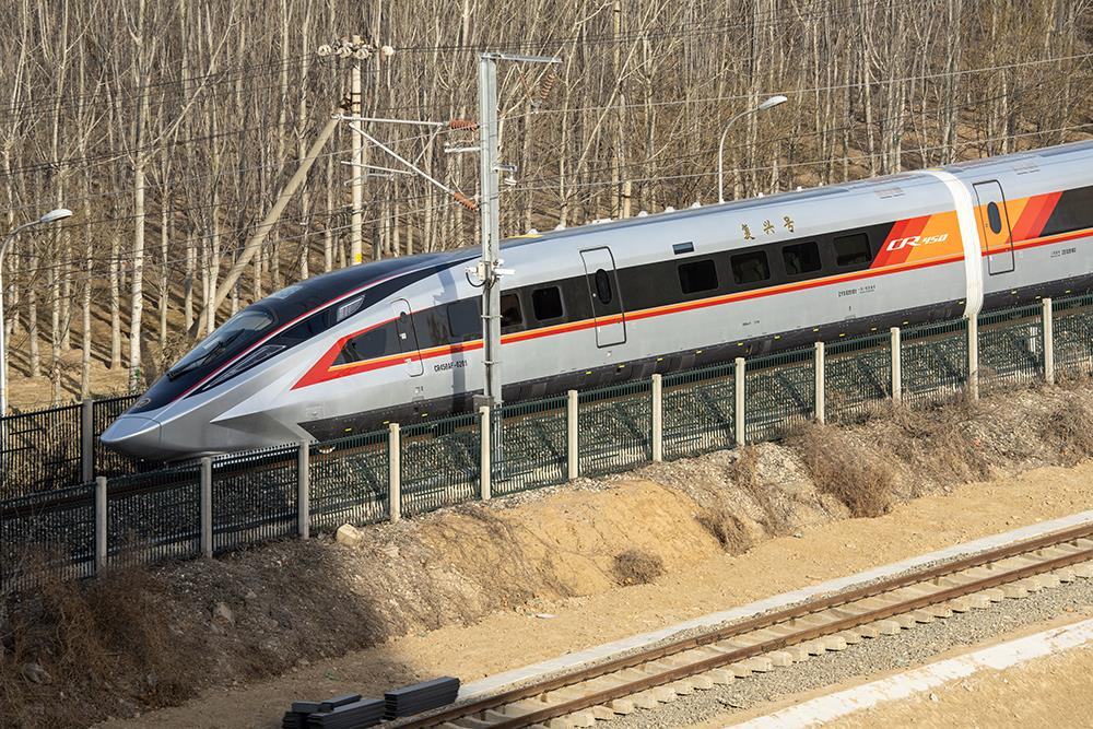 △2025年2月15日,中國(guó)鐵道科學(xué)院試驗(yàn)中心環(huán)形試驗(yàn)場(chǎng),復(fù)興號(hào)CR450型電力動(dòng)車組進(jìn)場(chǎng)展開測(cè)試。