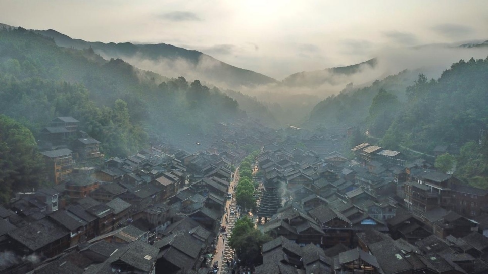 肇興侗寨內,古樸別致的吊腳樓掩映在青山綠水間。