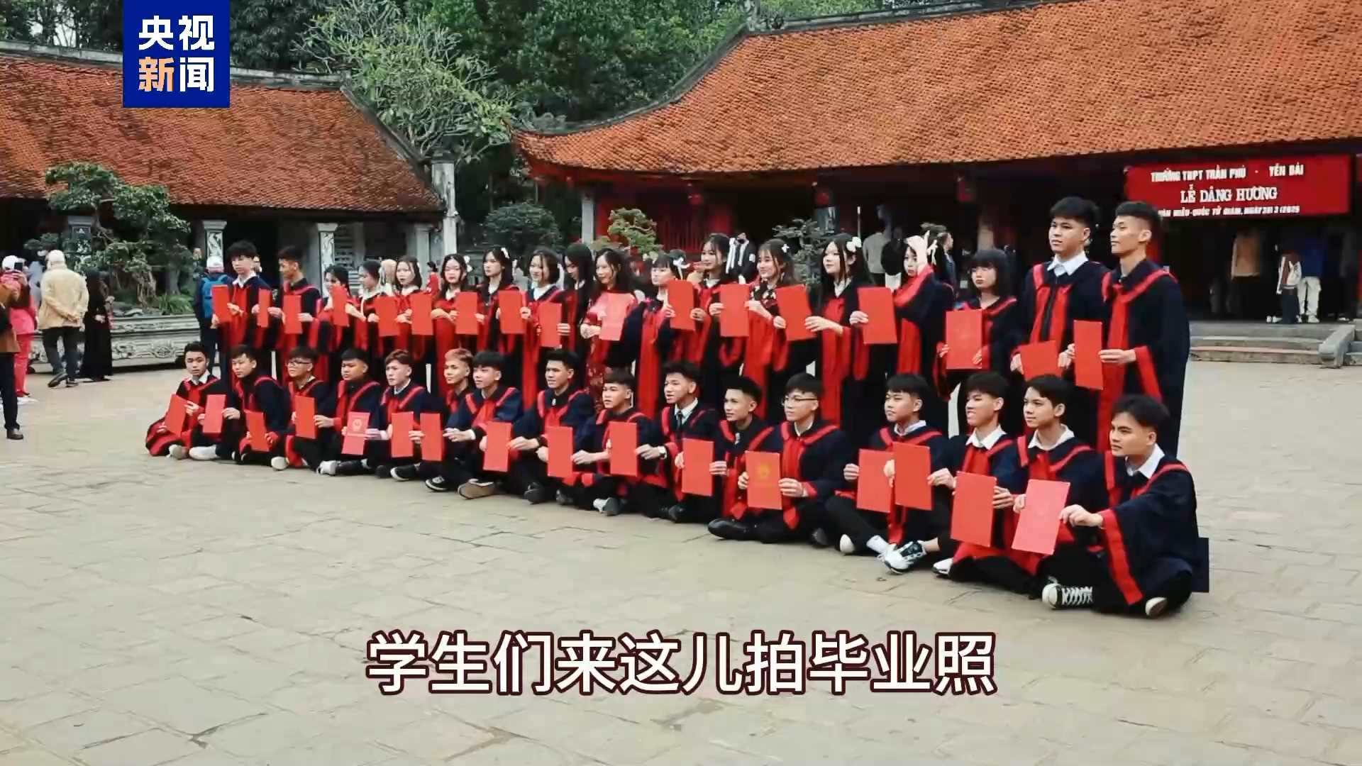 越南女學(xué)生:因?yàn)檫@里是一個(gè)神圣的地方,學(xué)生們來(lái)這兒拍畢業(yè)照,大家來(lái)文廟祭拜,希望能取得更好的學(xué)習(xí)成績(jī)。