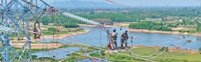 安徽省滁州市珠龍鎮(zhèn)220千伏清(流)環(huán)(漪)輸電工程現(xiàn)場,工人在高空中進行組塔作業(yè)。
