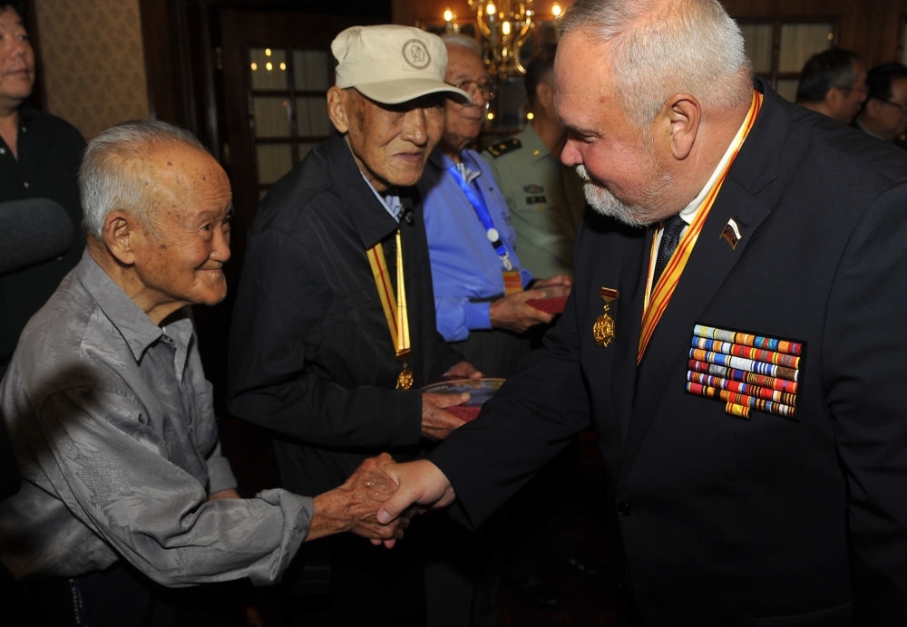 2015年9月5日,二戰(zhàn)蘇軍著名統(tǒng)帥瓦西里·崔可夫的外孫尼古拉·崔可夫(前右)與中國抗戰(zhàn)老兵代表在活動(dòng)現(xiàn)場交流。新華社記者 魯鵬 攝