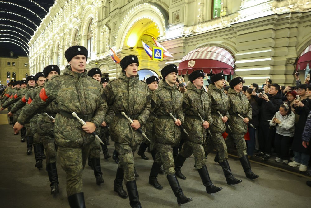 5月3日晚,受閱方隊(duì)在俄羅斯首都莫斯科前往紅場參加彩排。當(dāng)日,俄羅斯紀(jì)念蘇聯(lián)偉大衛(wèi)國戰(zhàn)爭勝利80周年閱兵式彩排在莫斯科舉行。新華社記者 姚大偉 攝
