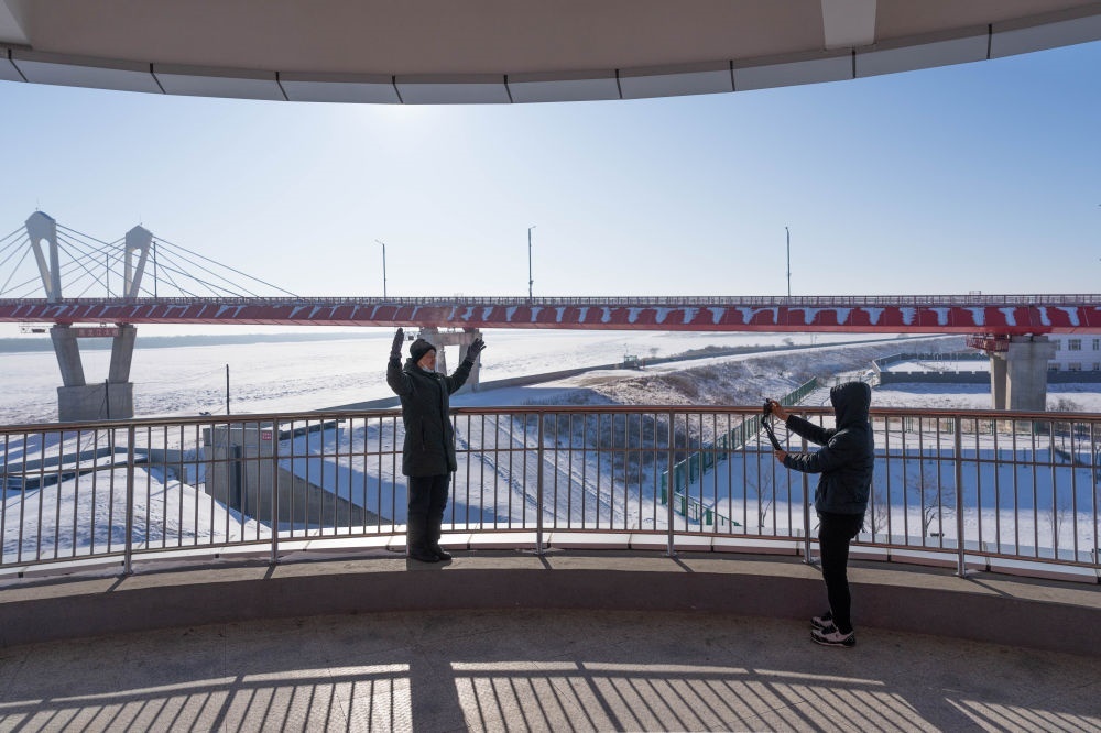 2024年1月30日,游客在黑龍江省黑河市黑龍江大橋公園內(nèi)的觀光塔上留影。黑河—布拉戈維申斯克黑龍江大橋于2022年6月10日正式通車,是中俄首座跨黑龍江(俄羅斯稱阿穆爾河)界河公路橋,在中國(guó)東北地區(qū)和俄羅斯遠(yuǎn)東地區(qū)之間開辟了新的國(guó)際運(yùn)輸通道。