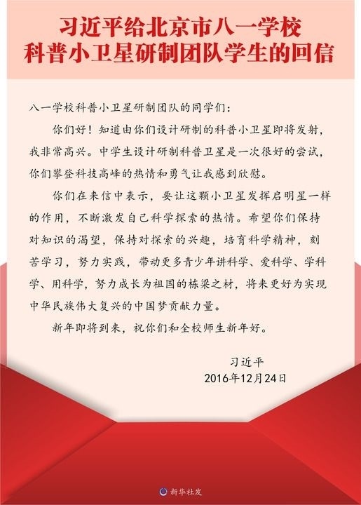 三個(gè)多月后,同學(xué)們給習(xí)近平總書記寫信,報(bào)告小衛(wèi)星即將發(fā)射的消息,很快收到了總書記的回信。習(xí)近平總書記在回信中說,“你們攀登科技高峰的熱情和勇氣讓我感到欣慰”“希望你們保持對知識的渴望,保持對探索的興趣,培育科學(xué)精神,刻苦學(xué)習(xí),努力實(shí)踐,帶動(dòng)更多青少年講科學(xué)、愛科學(xué)、學(xué)科學(xué)、用科學(xué),努力成長為祖國的棟梁之材”。