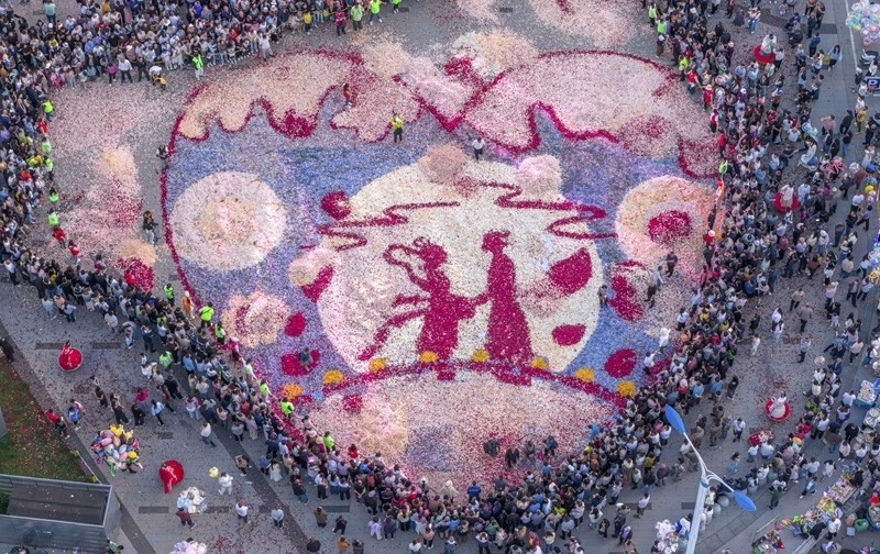 8月29日七夕節(jié),人們?cè)谠颇鲜±ッ魇袝x寧區(qū)觀看用玫瑰花瓣鋪就的巨幅圖景《云間鵲橋·花雨鋪路》(無人機(jī)照片)。