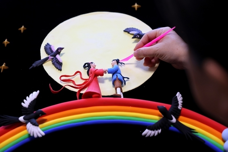 8月29日七夕節(jié),在山東省棗莊市非物質(zhì)文化遺產(chǎn)保護(hù)中心,民間藝人創(chuàng)作面塑作品《鵲橋會(huì)》。