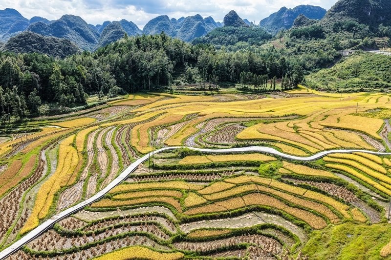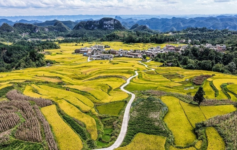 長順縣長寨街道擺塘梯田風(fēng)光(9月17日攝,無人機照片)。