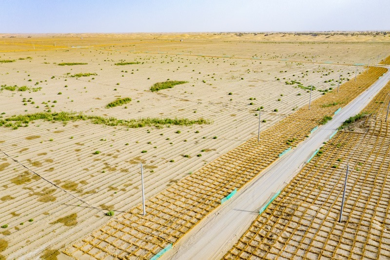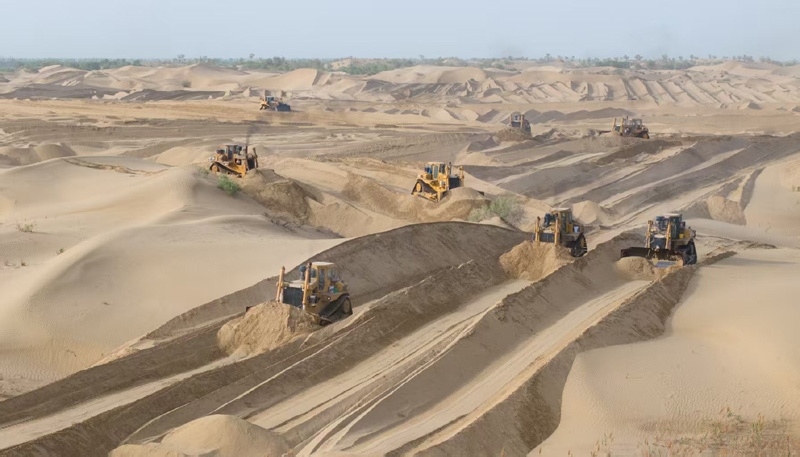 5月22日,在新疆尉犁縣境內(nèi)的塔里木河南岸防沙治沙區(qū),大型機(jī)械在平整沙丘(無(wú)人機(jī)照片)。