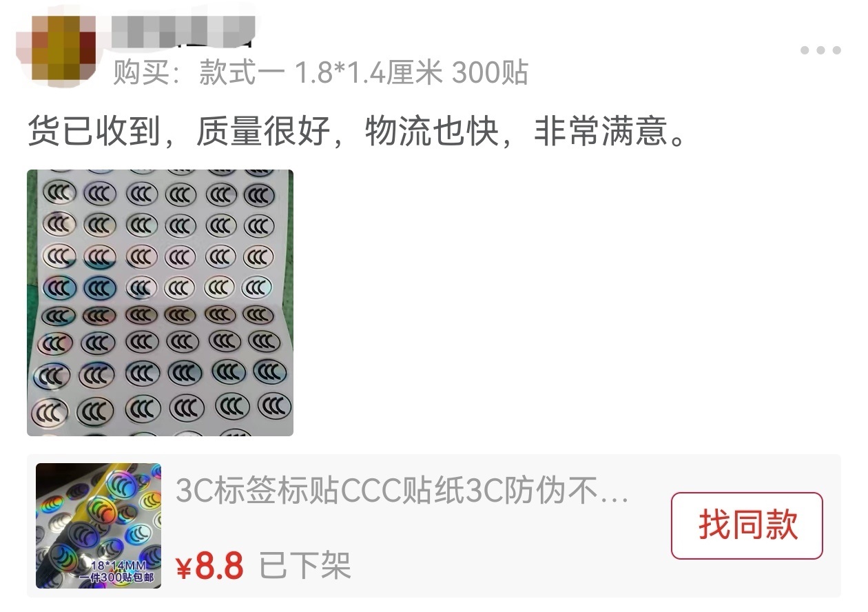 不過,這卻變成了一些人眼中的“商機”。中國新聞網(wǎng)《民生調(diào)查局》記者在部分電商平臺發(fā)現(xiàn),“3C貼紙”目前仍有售賣,甚至可以隨意定制。