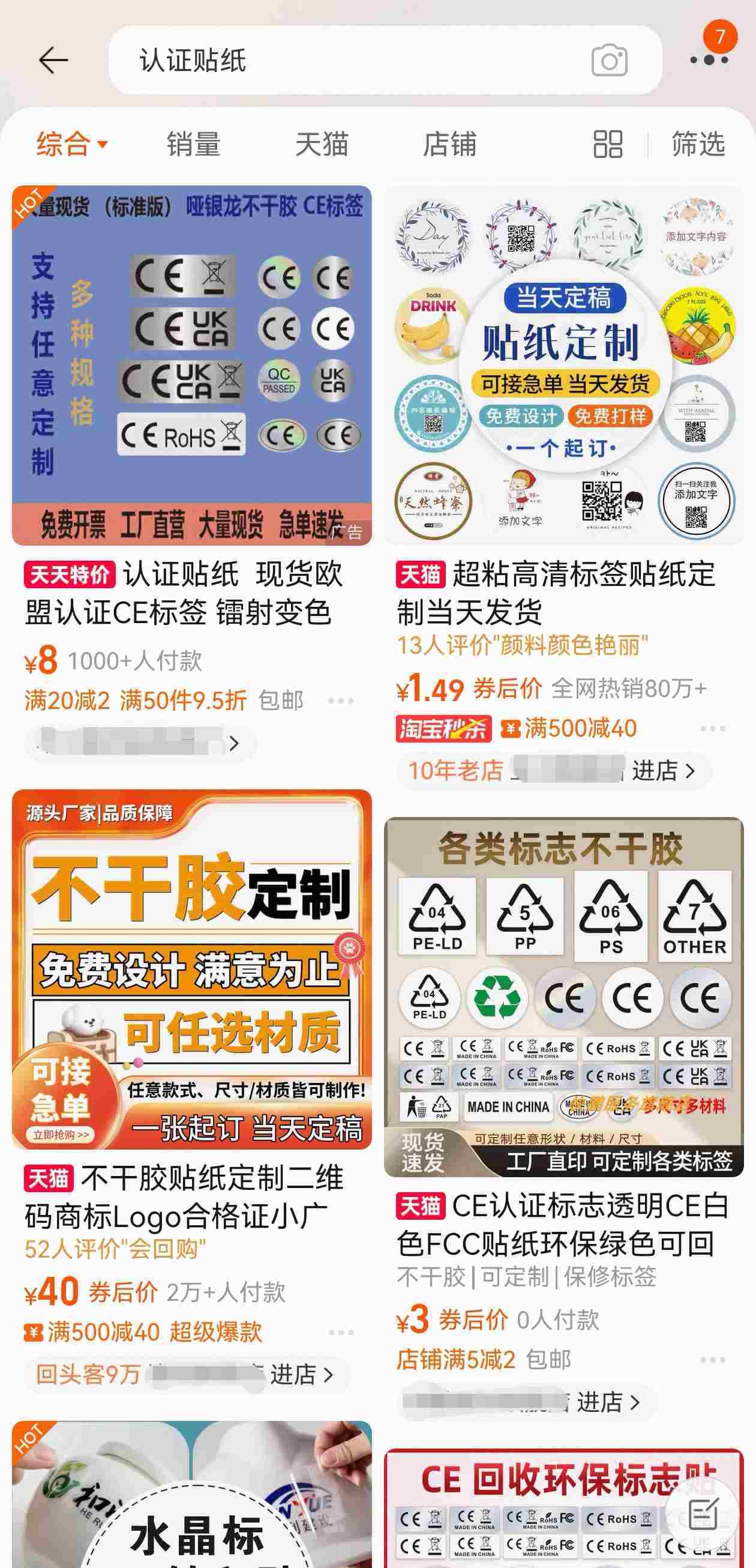 7月1日,記者在多個電商平臺發(fā)現(xiàn),雖然已無法在平臺搜索到“3C貼紙”相關(guān)商品,但仍存在大量“定制貼紙”“定制標識”類商家。
