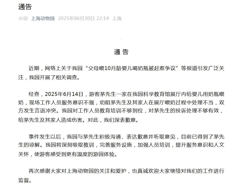 《通告》中稱,經(jīng)查,2025年6月14日,游客茅先生一家在該動物園科學教育館展廳內(nèi)給嬰兒用奶瓶喂奶,現(xiàn)場工作人員服務意識不強,勸阻茅先生及其家人在展廳喂奶過程中處理不當,雙方發(fā)生言語沖突。對工作人員教育培訓不夠到位,對茅先生的投訴處理不夠有效,給茅先生及其家人造成傷害。對此,上海動物園深表歉意。