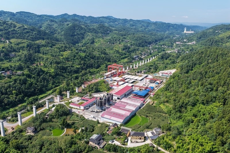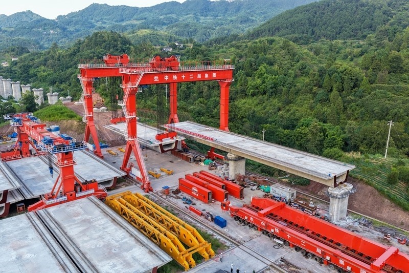 7月5日拍攝的渝萬高鐵江林村特大橋架梁施工作業(yè)現(xiàn)場(無人機照片)。