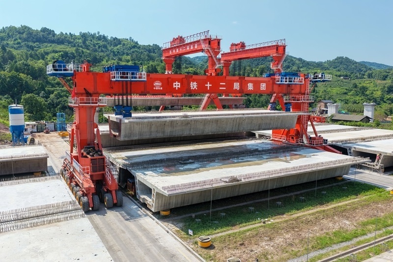 7月5日,渝萬高鐵江林村特大橋架梁施工作業(yè)現(xiàn)場,運梁機械在轉(zhuǎn)運預(yù)制箱梁(無人機照片)。