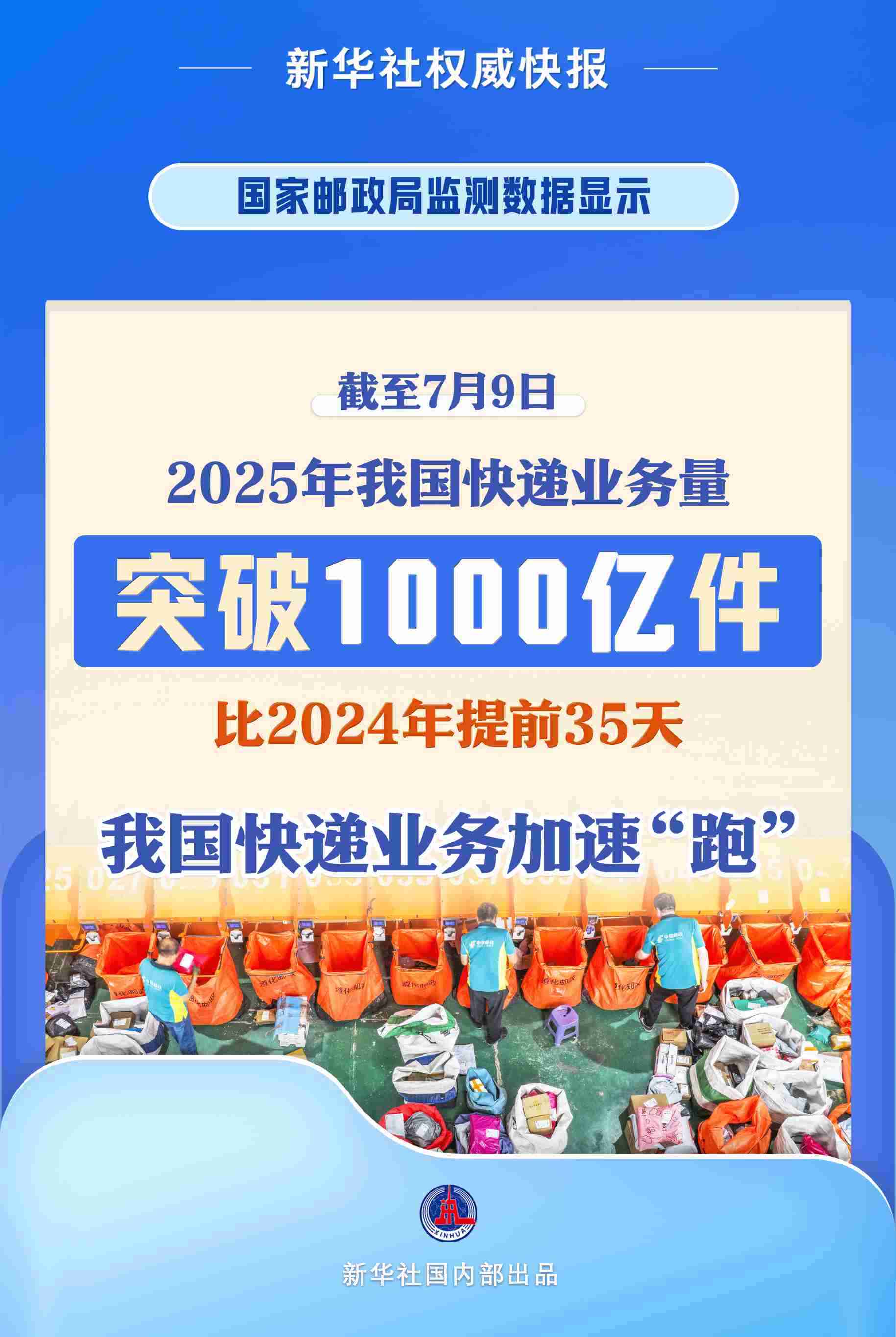 新華社北京7月10日電(記者葉昊鳴)記者10日從國家郵政局了解到,根據(jù)國家郵政局監(jiān)測數(shù)據(jù)顯示,截至7月9日,2025年我國快遞業(yè)務量突破1000億件,比2024年達到千億件提前35天。