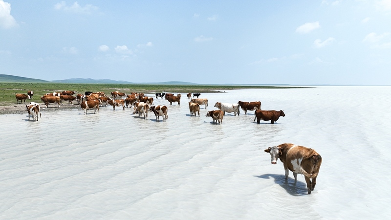 7月11日在內(nèi)蒙古錫林郭勒盟太仆寺旗拍攝的白音查干湖邊的牛群(無人機照片)。