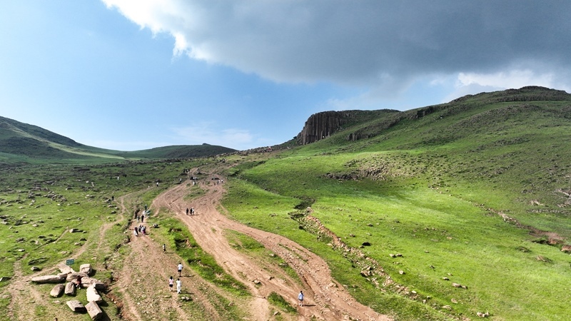 7月11日,游客在內(nèi)蒙古錫林郭勒盟太仆寺旗石條山游玩(無人機照片)。