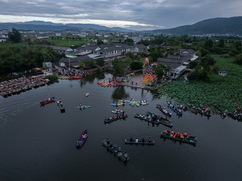 7月19日,人們在大理西湖歡度水上火把節(jié)(無人機照片)。